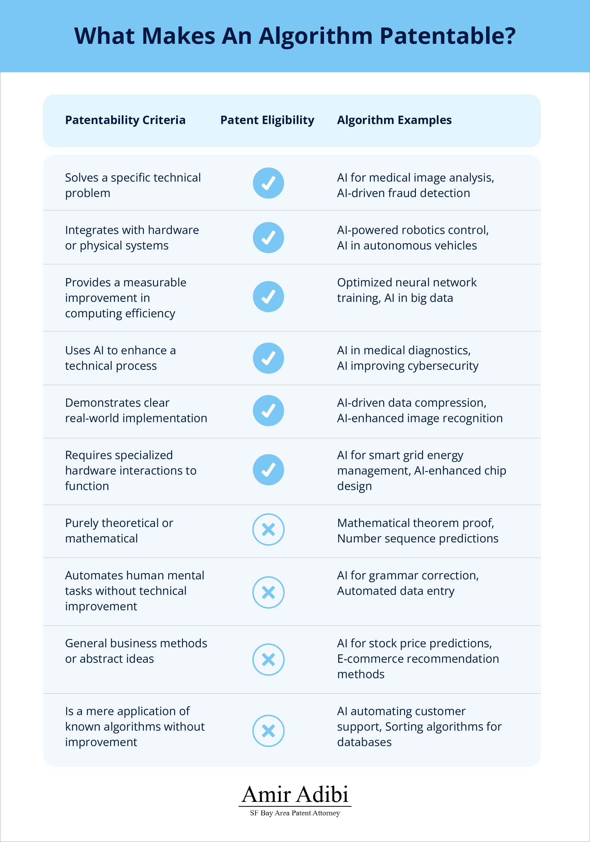 - It is useful and specific: The algorithm must be integrated into a real-world application that solves a concrete technical problem—resulting in measurable improvements such as increased efficiency, enhanced performance, or cost reduction. It must be part of a tangible process, system, or device that yields a clear technological benefit.
