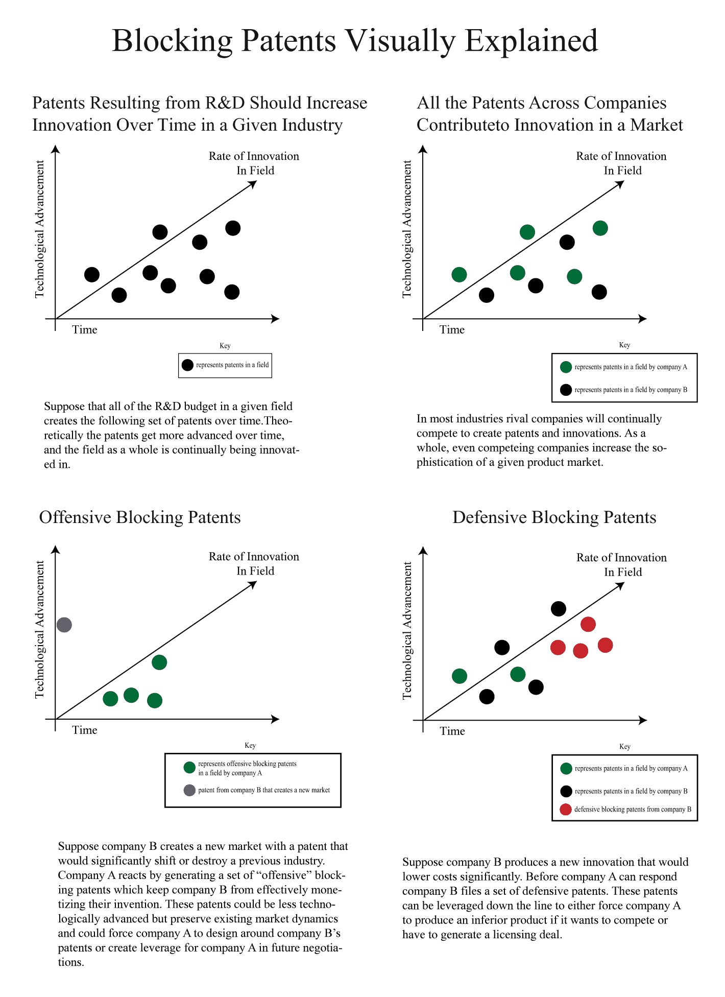 - “Blocking patents: What they are and what they do” by Dominique Guellec, Catalina Martinez, and Pluvia Zuniga in 2008. According to the authors, “When the exclusionary power provided by patents is aimed at keeping competitors off a particular market or technology field rather than at protecting an invention, patents become a strategic blocking tool for offensive or defensive purposes.” In other words, the purpose of a blocking patent is not simply to protect the patent owner’s invention against copycats, but to prevent competitors from putting rival products on the market that might redirect revenue away from the original patent holder. (similar to William’s battery technology in our bluetooth speaker example)